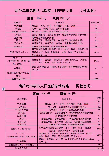 为回馈广大人民群众对葫芦岛市第四人民医院的支持和信任,特推出“女神节”优惠体检套餐,优惠力度空前之大,诚挚欢迎您来我院体检,我们精心准备了贴心,周到,全面的体检服务,为您的健康保驾护航!